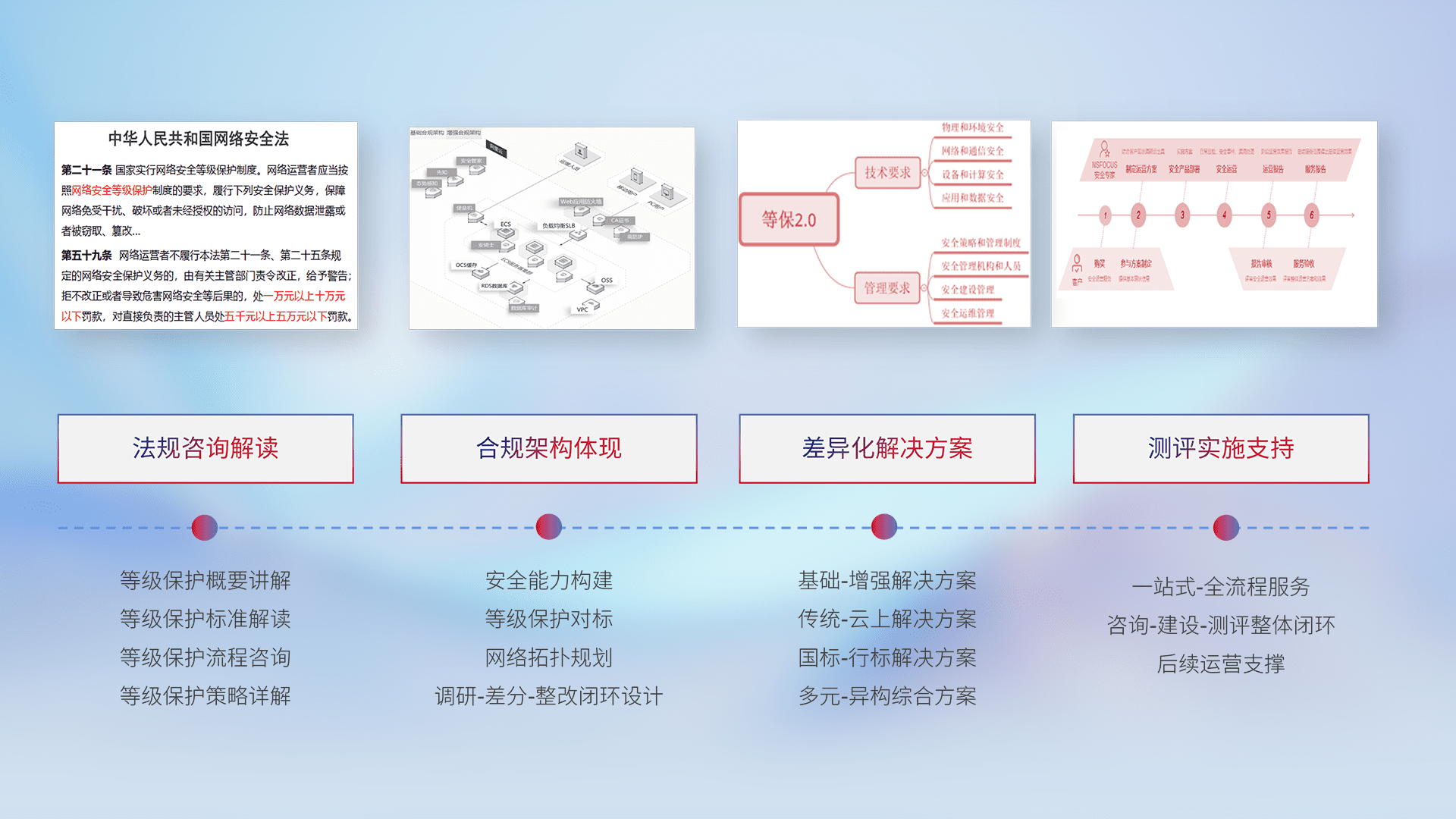 通过专业的法律咨询解读、、、合规架构体现、、差异化解决方案、、、、测试实施支持等服务,,,,为客户量身打造等保合规体系。。。。